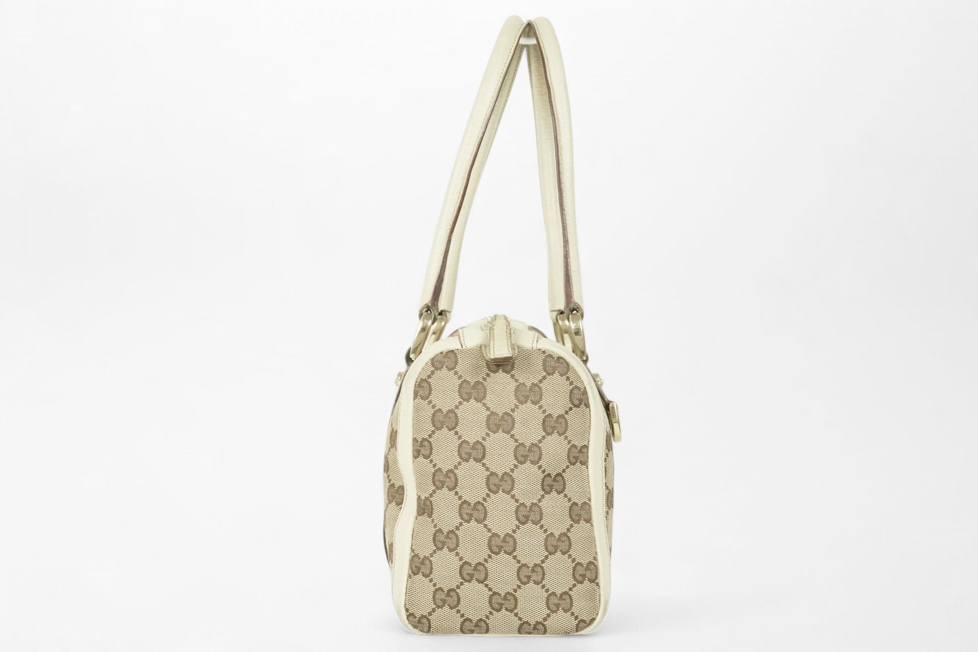 Iconic Boston silhouette in beige/ebony GG canvas with light leather trim and dual top handles.