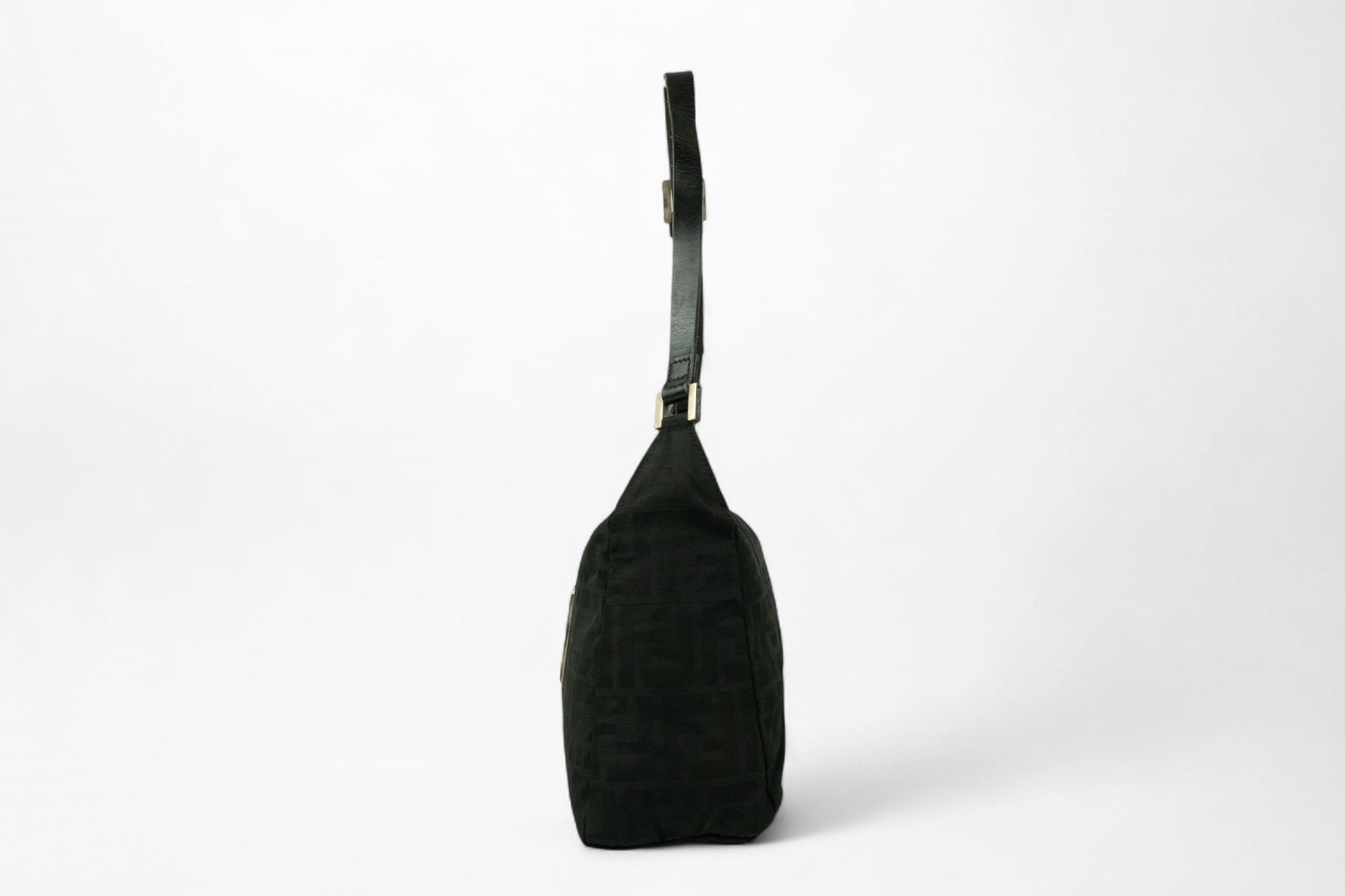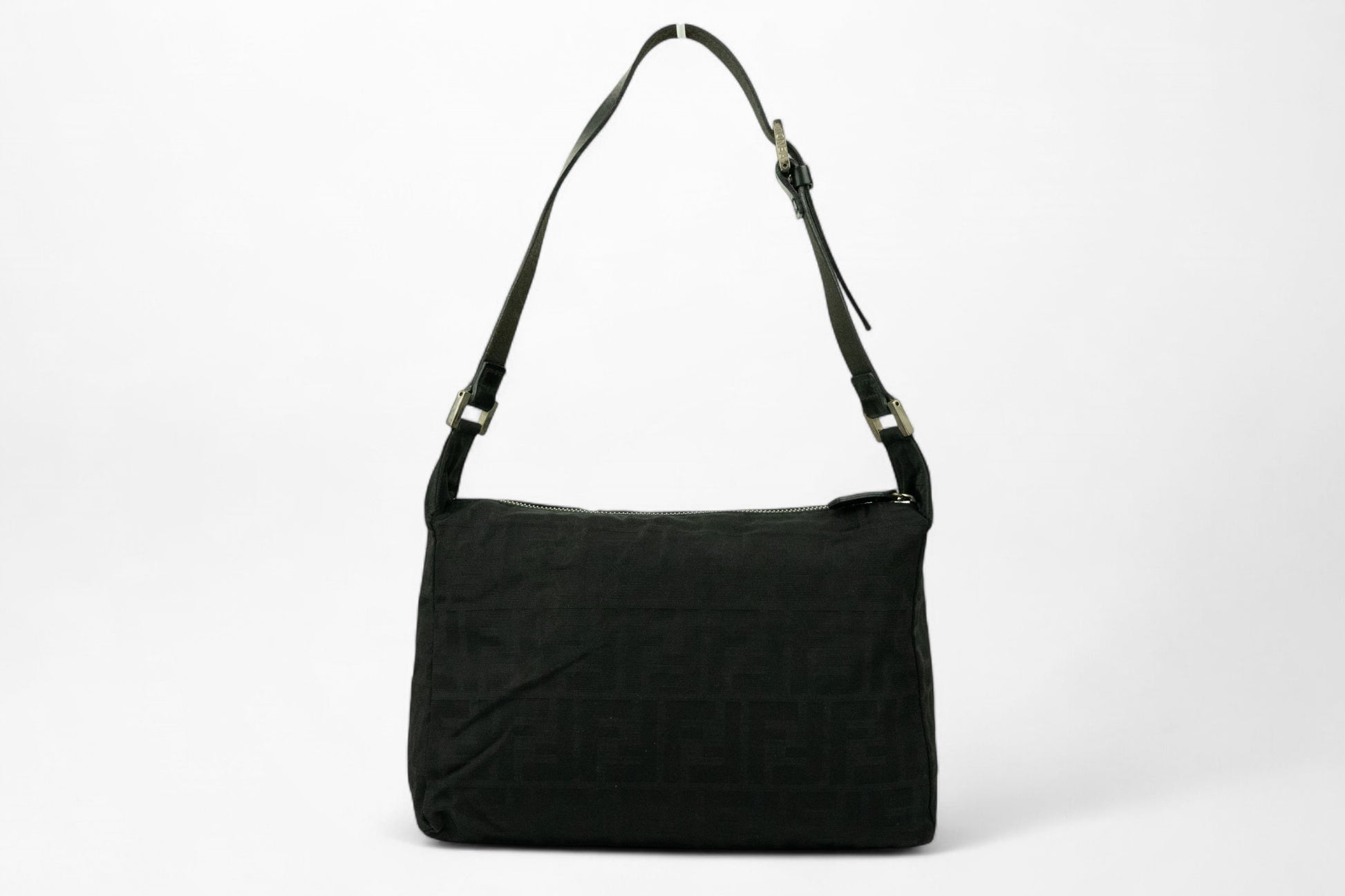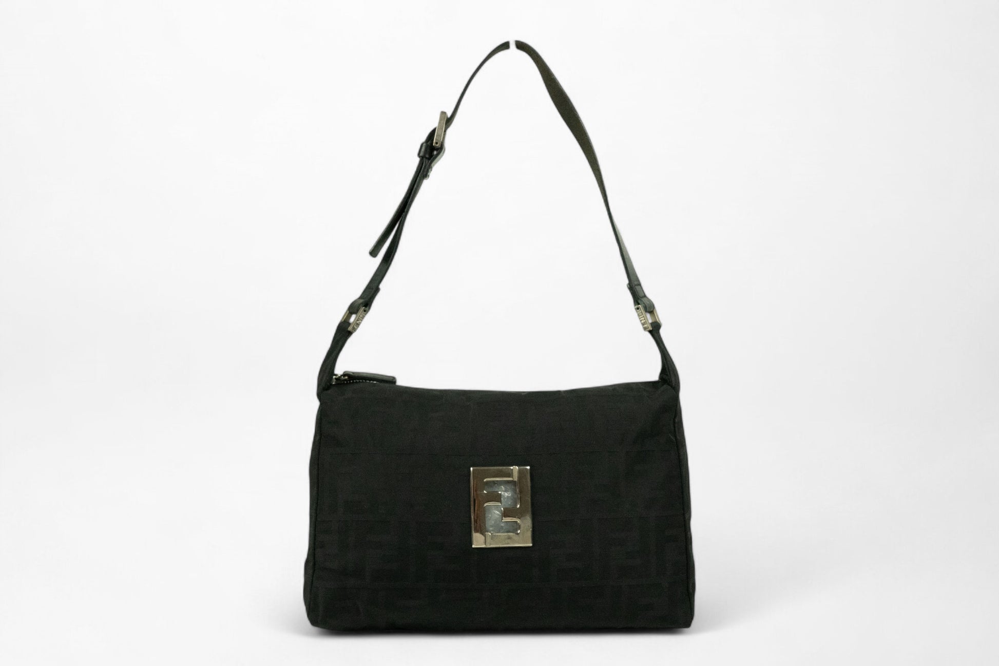 Iconic baguette silhouette in signature FF jacquard nylon with leather trim and adjustable shoulder strap.