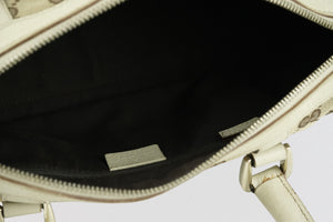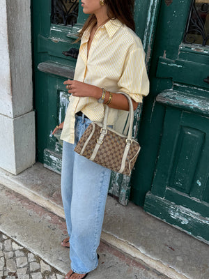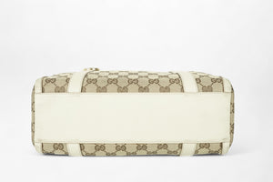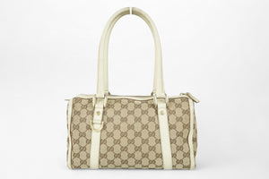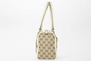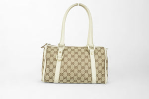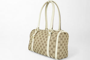 Silhueta icónica Boston em lona GG bege/ébano, com acabamentos em pele clara e dupla pega superior.