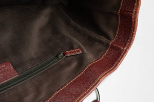 Clássica tote em lona GG bege/ébano, com acabamentos em pele borgonha e alças de ombro.
